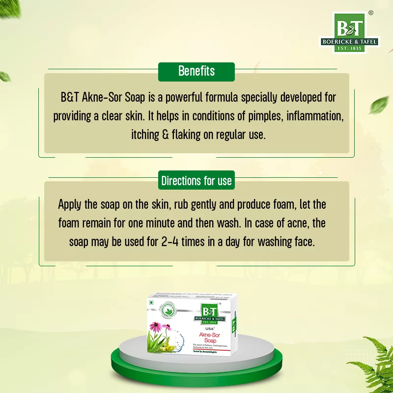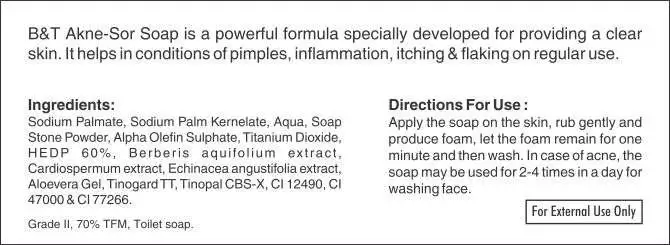 B&T Akne – Sor Soap is a powerful formula specially developed for providing a clear skin. It helps in conditions of pimples, inflammation, itching and flaking on regular use. Presentation: 75 g * Berberis aquifolium is a well-proven remedy for acne and psoriasis * Cardiospermum is known for flaky eruptions like psoriasis * Echinacea angustifolia boosts up the immunity and protects the skin from various infections * Aloe vera reduces the inflammation and itching