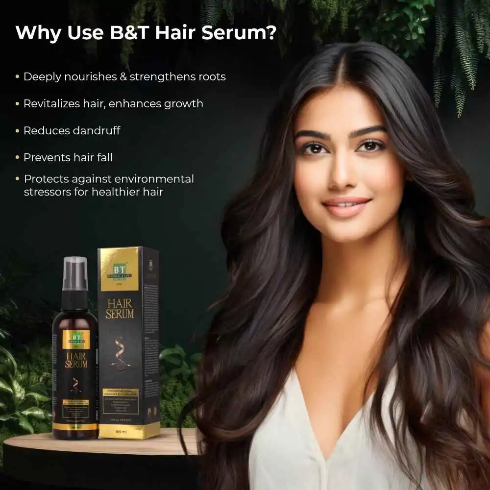In the pursuit of holistic wellness, skincare and overall health often take center stage, but hair deserves equal attention. Just as skin requires specialized care to remain healthy and radiant, hair and scalp need targeted nourishment to withstand daily challenges. B&T HAIR SERUM – a specially-formulated blend brings together the wisdom of nature and modern haircare science to provide hair and its roots with the ultimate care they deserve. B&T HAIR SERUM is carefully crafted to address and alleviate common hair concerns such as dryness, weak roots, hair loss, and a lack of shine. This innovative serum is designed to revive and strengthen hair, providing a complete solution for better hair health. The serum uses nature’s power to stimulate healthy hair development, fortify hair from the roots, and improve overall hair structure. B&T HAIR SERUM, with its capacity to profoundly permeate the scalp and nourish hair, is an ideal ally for individuals looking to restore vitality and shine to their hair.